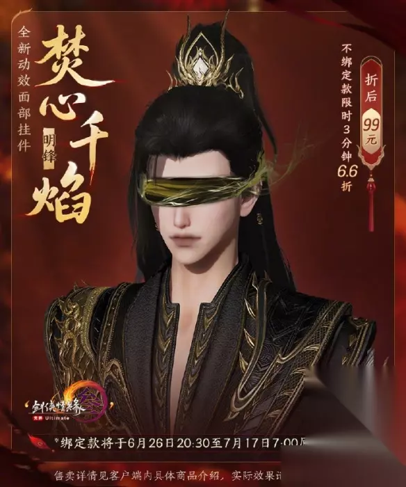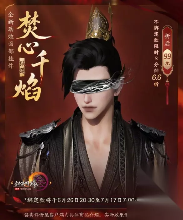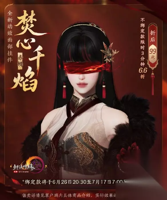 惊艳亮相!《剑网3》全新动态光效面部挂件——焚心千焰,即将点燃江湖!这款备受瞩目的面挂不仅拥有震撼的动态效果,更有赤鳞、地莲、明锋三款配色任君挑选。更劲爆的是,首发三分钟限时66折,仅需99元即可拥有!原价可是150元!接下来,就带你全方位揭开焚心千焰的神秘面纱!