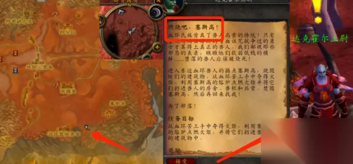 2、然后来到图中位置,从血环苦工手中夺得火炬,利用塞斯高的熔炉点燃火炬。