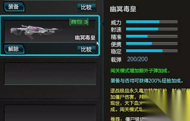 幽冥毒皇:闯关神器之一,射击可以叠加对僵尸的伤害,还能发射烈毒液弹,目前小伙伴主要用该武器挑战僵尸猎场和塔防模式。在闯关模式里面还会有额外的子弹加成,让幽冥毒皇在闯关模式里面的续航能力大幅提升,僵尸猎场里面搭配急速狂热能够使用毒液弹快速清理小怪或者挑战boss时更快叠加被动伤害,想怎么使用就看各位小伙伴的了。