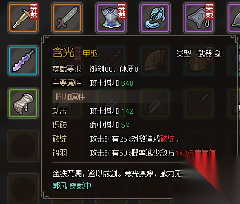 《大侠立志传》里的含光剑、鱼肠剑、干将剑是金色甲级长剑,获取方式为拜入琅琊剑阁,打败大师兄可三选一,若杀穿剑阁就能将三把剑全部获取。