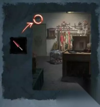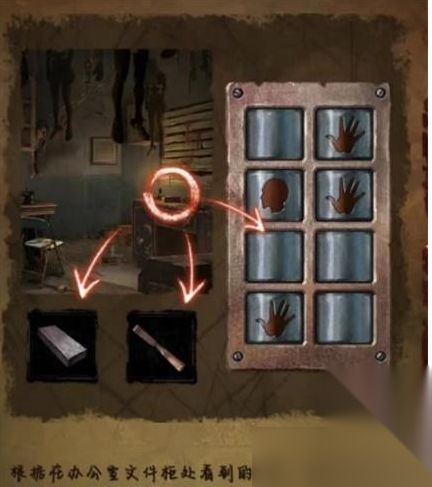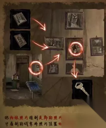 4.回到办公室,把饰品放到奖杯凹槽上,拾取照片,把两张照片挂到走廊的照片墙上。根据日记中看到的线索将位置摆放,得到钥匙,回到办公室,利用钥匙打开里处的门。