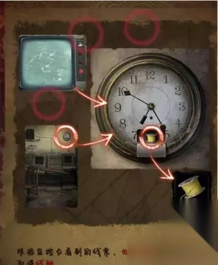 5.进入监控室,用磨刀石打开开关,根据监控台看到的线索,如图调整钟表取得线轴,在监控台频道以一次红两次蓝三次白五次红点亮按钮。