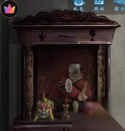 12.进入里面的房间摆放物品得到布球供奉在喜娃娃的神龛上,再进入右边的房间点到戏台得到提示来到舞台。 13.摆放蝴蝶得到靠旗拨浪鼓将拨浪鼓摆放至神龛,靠旗插在最里面房间右手处得到布老虎供奉神龛得到,打开大门高能预警。