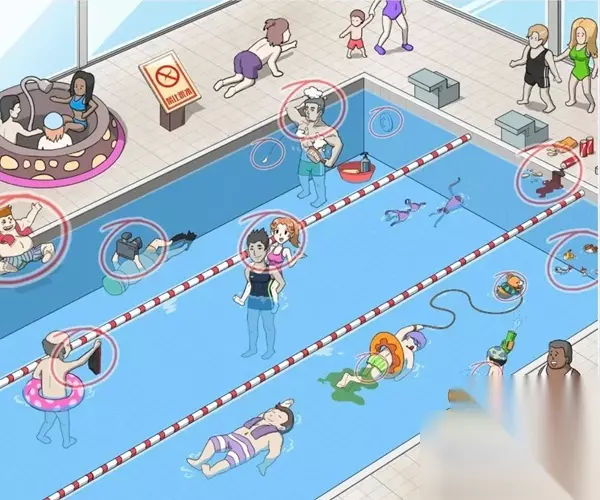 无限脑洞花样泳池通关攻略一览 花样泳池十二个不文明的禁止事件答案: 禁止跳水找到跳水的胖子、在泳池中拿摄像机的、赤裸的大爷、在泳池中洗澡的、电线掉在泳池中、右边水闸开的、饮料喝薯片零食掉在水池里、柯基、水池中小便 依次点击如图中所画出的圈圈中的人,就可以过关。