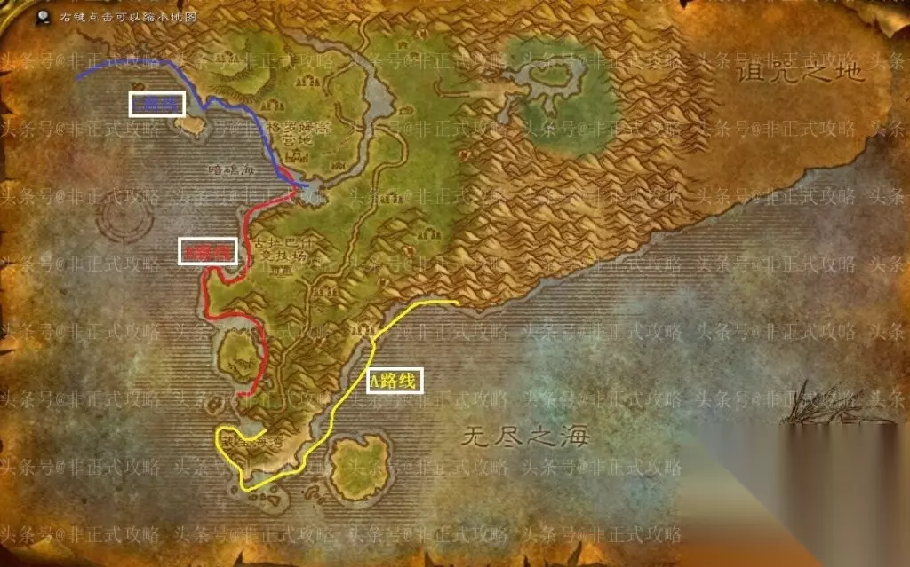 二、参加大赛之前需要准备什么? 1、一个鱼竿,至少钓鱼专业技能达到150(在荆棘谷水域钓鱼的最低要求是150,避免跑鱼最好达到225以上)。想参加活动的抓紧时间练钓鱼技能,附钓鱼冲300攻略。 2、可以适当准备一点+100的鱼饵和药剂,比如水面行走药剂、轻羽毛、速游药水、迅捷药水等等。 3、怀旧服的公共频道刷屏非常快,需要提前创造一个纯净频道能单独看得到地精喊话的,或者是关掉其它广告频道。 4、确认开启了游戏中的“自动拾取”选项。 5、把游戏的主音量和音效声音开大(环境、音乐都调至最小),保持安静,很多时候是靠听声音收杆,在如此紧张的比赛里很难做到紧盯水面20多分钟,眼睛也会非常疲劳。 6、把钓鱼和坐骑的键位设在相邻位置,适宜你自己的最方便的快捷键位。 7、周日下午比赛前,提前15~20分钟到荆棘谷就位准备,若是在PVP强势服务器,还得提前联系好几位左右大护法。PVE服务器突然多了一丝优越感~ 8、把炉石定在藏宝海湾的旅馆,且保证炉石是可以使用的状态,出了旅馆左拐就是交任务的NPC。 9、利用20分钟的时间把整条荆棘谷海岸线巡视一遍,了解玩家分布状态,从下图A(黄线)、B(红线)、C(蓝线)三条路线中确定最终的选择。(在别人不熟悉的地方钓鱼。这个说起来容易做起来难。我不会推荐特定的位置,因为再人迹罕至地方最终也会被熟知......)