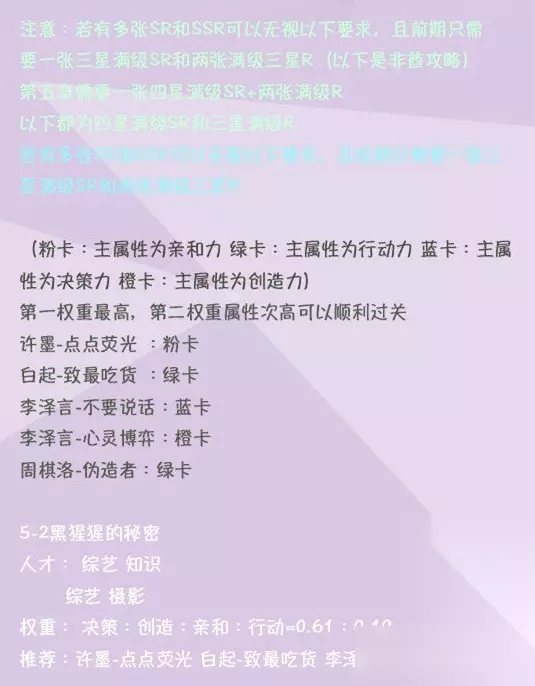 2.恋与制作人攻略第五章: 关卡名称:5-8,专家要求1:娱乐、细心【推荐专家:南枫、郭宝儿、脱兔、林萌萌】专家要求2:娱乐、营销【推荐专家:肯塔】最高两个属性:亲和力>行动力,掉落:U盘,权重(分数占据比例):决策力:0.35,创造力:0.45,亲和力:0.65,行动力:0.55,关卡名称:5-9,专家要求1:剪辑【推荐专家:魏宅生、郭宝儿、卓尾、杨婕、赵坚强】专家要求2:热情【推荐专家:阿诺德、牛鲜花、苏菲、乔治】最高两个属性:行动力>创造力,掉落:VR设备,权重(分数占据比例):决策力:0.45,创造力:0.55,亲和力:0.35,行动力:0.65,关卡名称:5-11,专家要求1:纪录片、后勤【推荐专家:松下敬助、贺尊】专家要求2:纪录片、公关【推荐专家:瑞克、马英俊、松下敬助、苏菲】