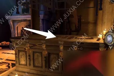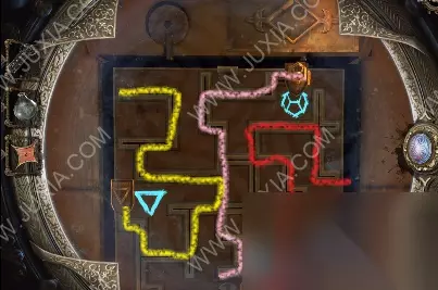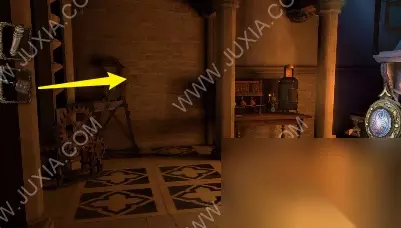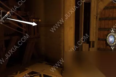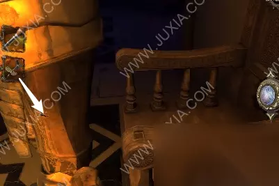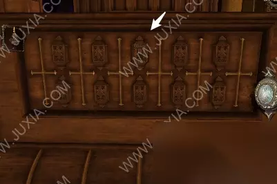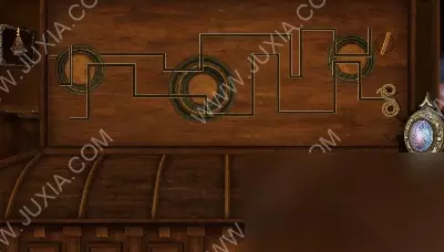 94.黄箭头处按下,底下小木盒打开获得奇怪的锁装置和一封信;黄箭头处放奇怪的锁装置,将木块旋转至下图图案,机关启动,接下来,进入第六关