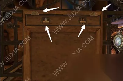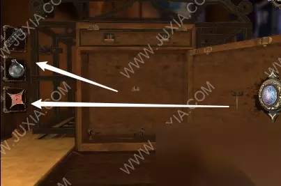 82.白箭头处放入灯泡;黄箭头处放入四角奖章,按照对应的颜色转动方块,完成后第一个抽屉里拿到阀门装置,黄箭头处记得移动滑块
