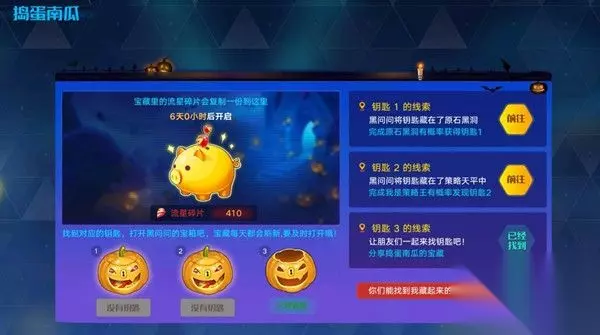 奥拉星手游捣蛋南瓜钥匙是本次万圣节活动中的一个道具,需要玩家根据钥匙线索来找出南瓜钥匙,钥匙分为三个线索,需要玩家根据每个线索的任务完成挑战,每天的钥匙任务都有变化,所以钥匙也需要重新获得哦,想要知道每日捣蛋南瓜钥匙位置的玩家可以来看看。 三份钥匙的线索 今日三份钥匙的线索分别为:完成原石黑洞挑战、完成我是策略王对战、分享捣蛋南瓜的宝藏。