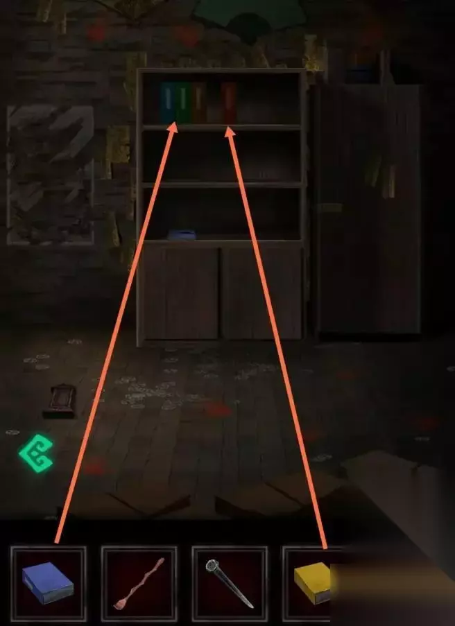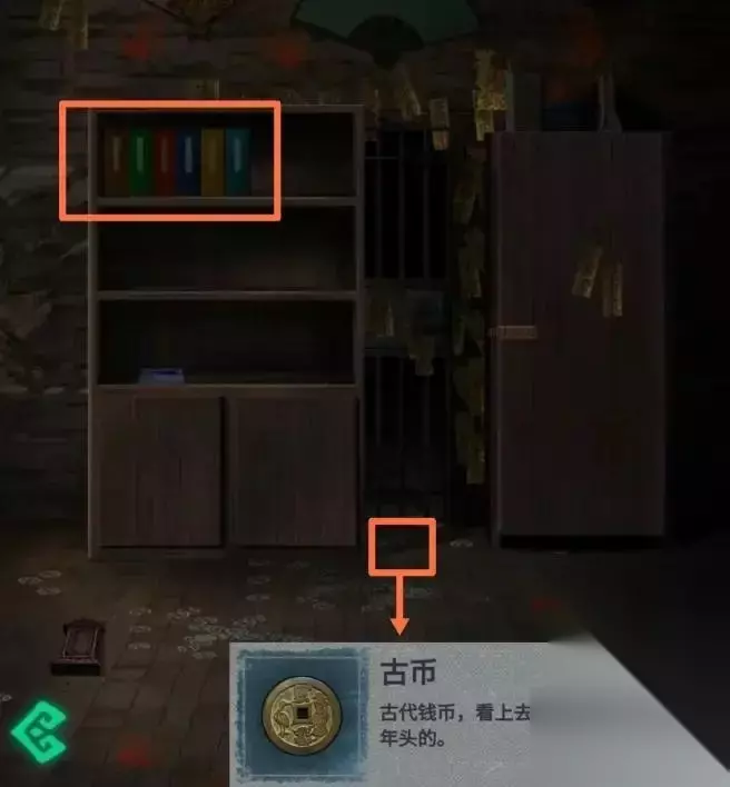 这六本书与裹尸布店里摆放的花圈的数量和颜色相对应,所以按照花圈摆放的顺序排列,如下图。 放置完毕后,书架会移动一半。书架和柜子之间的地上有一枚古钱币。捡起来就可以得到它。