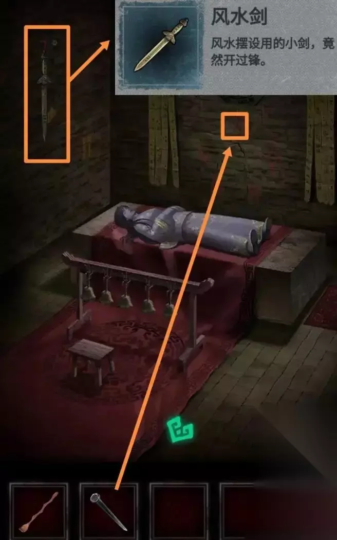 密码解锁后,即可进入关押莫琪的暗室。点击墙上的剑即可获得风水剑,并将钉子钉在镜子下面。