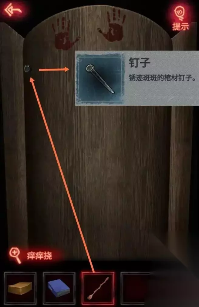 前往裹尸布店左侧的房间,点击棺材,使用痒痒去除钉子,获得钉子。