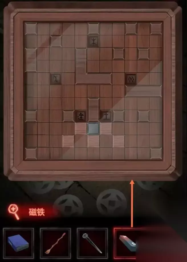 到地下室左侧的房间,点击右下角的箱子,把磁铁放在箱子上,就可以移动箱子里的木块,把剩下的木块推到五个区域。这个过程就不再演示了,本质上就是推箱子。 完成后获取区块。