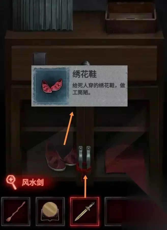 去寿衣店左边的房间,用风水剑砍断柜子上的绳子,得到绣花鞋。