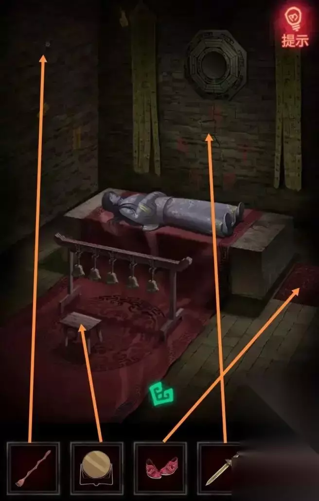 返回暗室,将四件物品放置在适当的位置,以破坏风水。把《痒痒痒》挂在左边墙上,把镜子放在凳子上,把绣花鞋放在莫奇右边的红地毯上,把风水剑挂在镜子下面。如下所示。