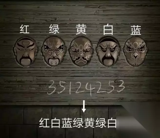 这五种颜色对应了书中五种脸谱的颜色,所以蓝色脸谱对应1,绿色脸谱对应2,红色脸谱对应3,黄色脸谱对应4,白色脸谱对应至5。 回到裹尸布店右侧的房间,把椅子和毯子移开,点击地上的Facebook机制。 面膜机构上有一串数字,对应着脸妆的颜色,分别是红、白、蓝、绿、黄、绿、白、红。按此顺序按对应颜色的脸妆。从左到右,它们是红、绿、黄、白、蓝。