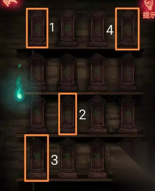 风水被破坏后,点击铃铛召唤莫奇的灵魂。根据白色皮影所指示的字符,依次敲响相应的铃铛。这个过程是随机的,不会再次显示。 灵魂召唤之后,莫奇的灵魂被分成了五份。跟随其中一个来到地下室左侧的房间。点击排名。可以看到灵魂按顺序停留在四个等级中,如下图所示的四个角色。