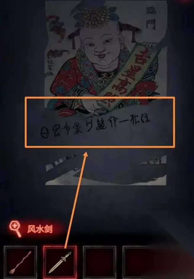 进入寿衣店右侧的房间,用风水剑打开年画,会看到一串特殊的字符。