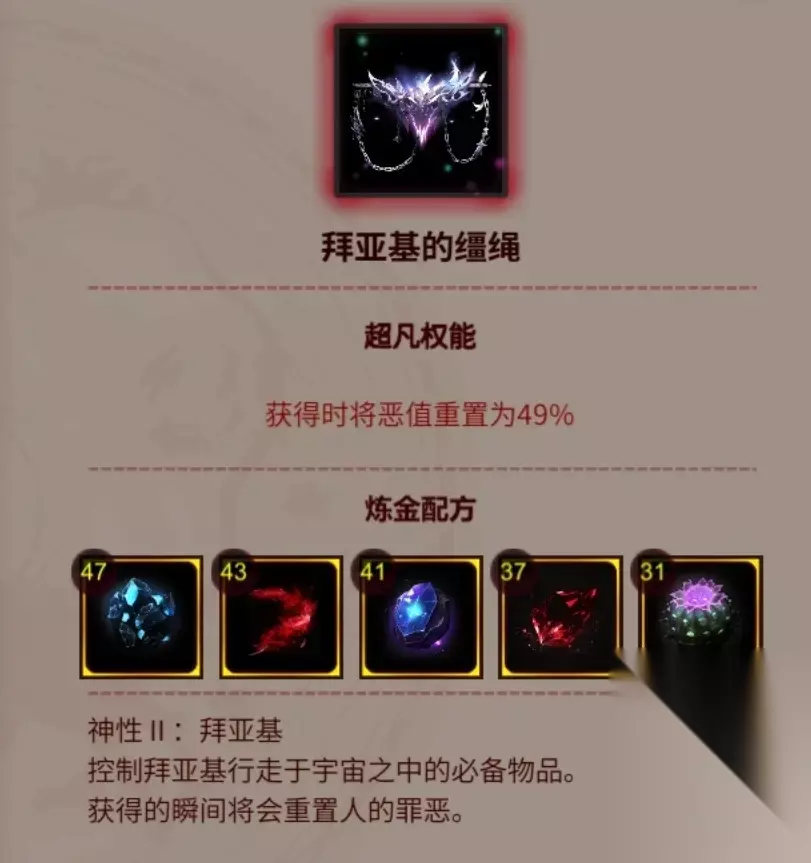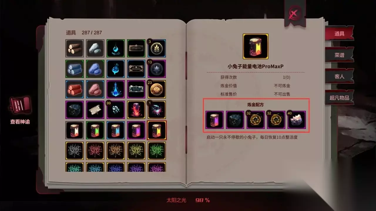 图鉴里显示有炼金配方的,就是可以从商人处购买炼金图纸,通过配方炼金获取的物品,如“小兔子能量电池ProMaxP”