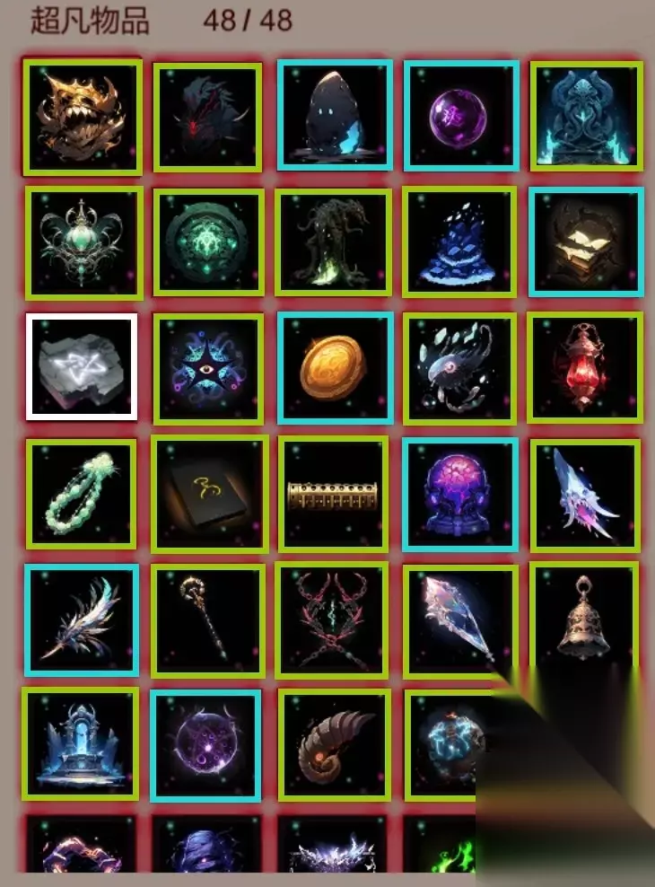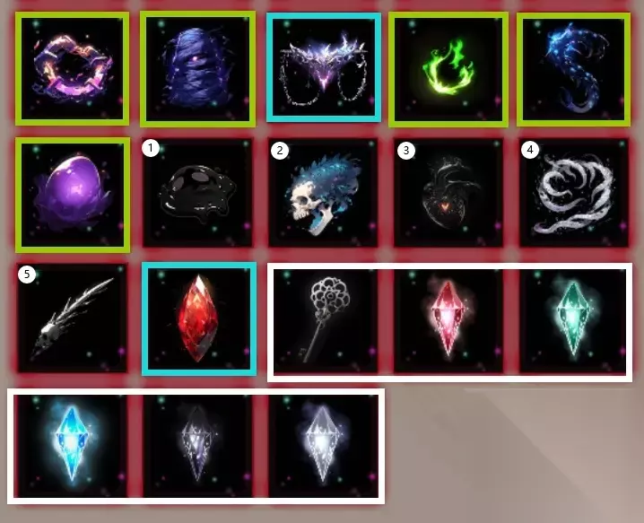 绿色框内物品是通过拍卖行获取,每期拍卖行都参加并全部拍下就行; 蓝色框内物品是通过配方炼金获取,图纸一般是商人出售,第二排第五个“死灵之书残卷”是升级耶芙娜房间给的; 白色框内物品是剧情获得; 没框标有白色序号的物品是通过自由炼金的产物价值在区间内概率获取:①2-10,②11-20,③21-30,④31-40,⑤41-50