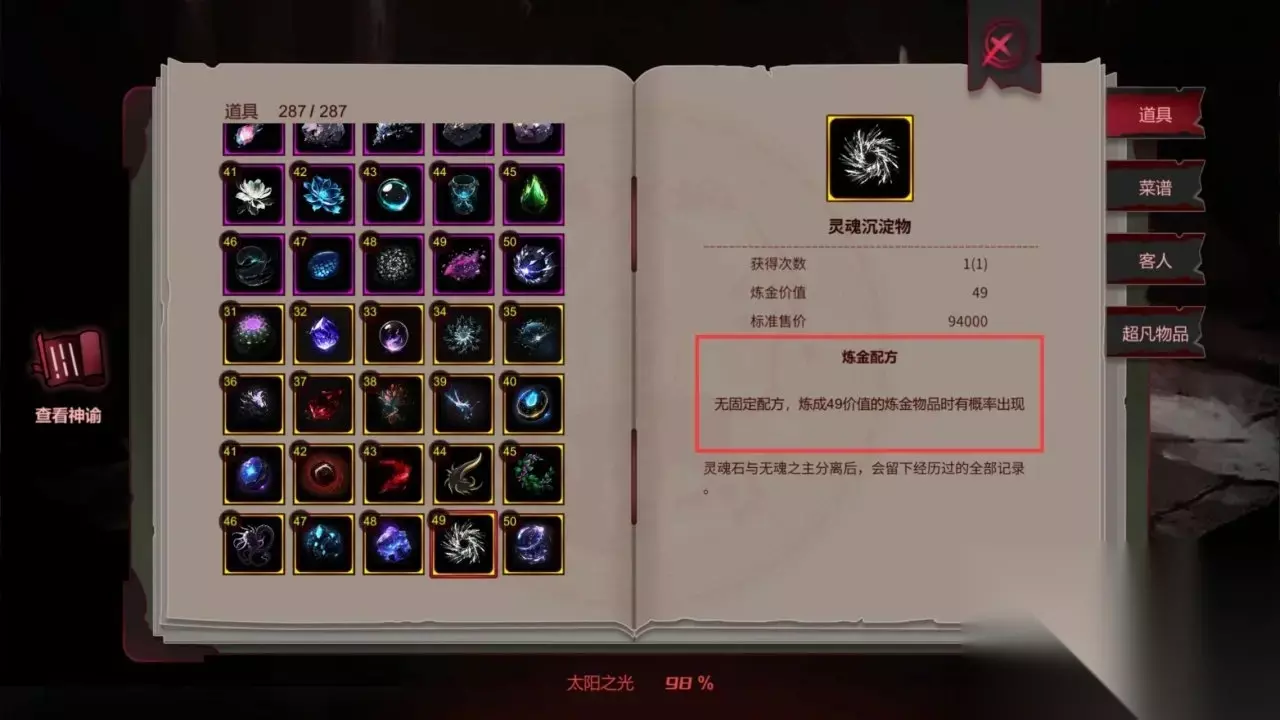 图鉴收集度是计算“道具”“神谕”“客人”“菜谱”“超凡物品”的总和,除了神谕都能一周目全部解锁。 神谕 一共有57个神谕,其中28个普通神谕,10个特级神谕,19个至高神谕。 特级神谕通过一个5级普通神谕加一个随机等级普通神谕合成,合成后5级普通神谕消失,或者叫升级? 特级神谕合成公式: [特]达贡的黄金=5达贡的黄金+达贡的金沙 [特]达贡的首饰=5达贡的首饰+达贡的眼泪 [特]法老之繁盛=5法老之繁盛+炼金术士之血 [特]法老之高贵=5法老之高贵+拉莱耶的幻影 [特]豪横之龙=5豪横之龙+奢耀之龙 [特]多产=5多产+门之主的祝福 [特]贪欲之龙=5贪欲之龙+威压之龙 [特]欺瞒之龙=5欺瞒之龙+怒吼之龙 [特]蔓生孢子连株=5蔓生孢子连株+复活节岛的雕像 一共有19个至高神谕,每4周可获得一个,但剧情只有48周,剩下的只能二周目获取,还好二周目可以继承图鉴进度。 其他成就基本上玩着玩着就自动解锁了,就不提了 非常感谢233乐园的每日更新,让我们能够及时了解到各种热门的游戏攻略。如果你在游戏过程中遇到任何问题,或者想了解更多关于《犹格索托斯的庭院》的技巧和策略,不妨常来看看本站的攻略,相信你会受益匪浅。让我们一起享受游戏的乐趣吧!
