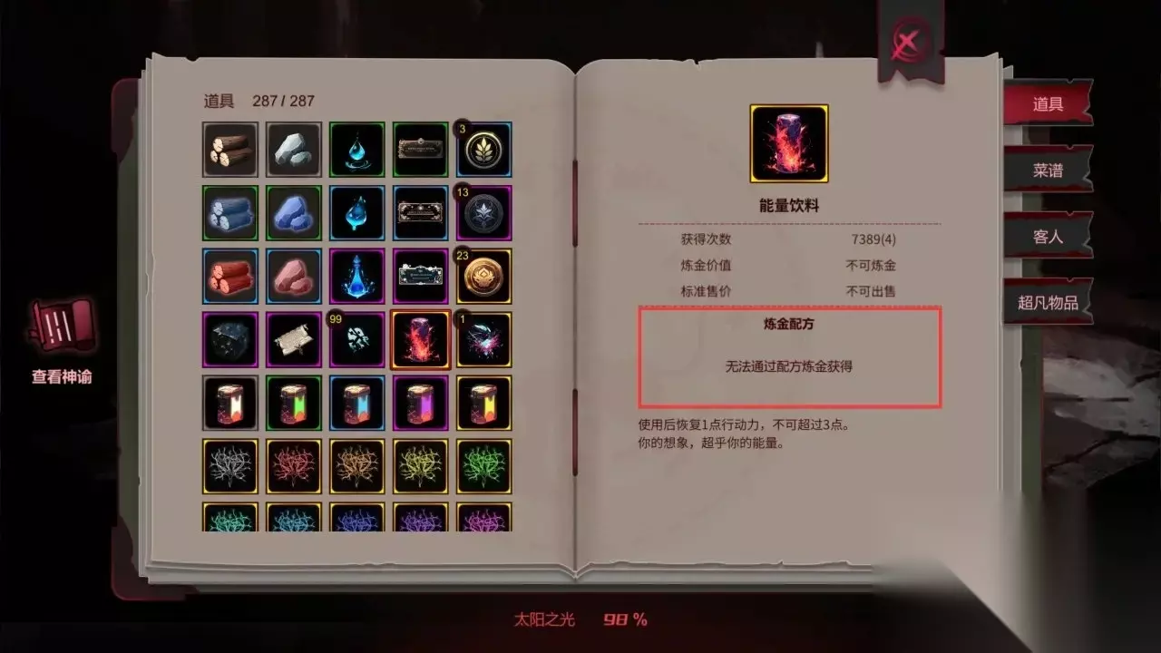 显示“无法通过配方炼金获得”,表示要么在商人处购买,要么通过旅店客人获得。