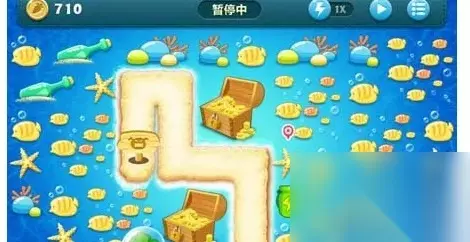 保卫萝卜深海13关怎么过: 第一步:开局下图位置放个绿瓶子快速打掉海星。海星开出一个鱼刺后攻击上面的宝箱,其他的3个升到满级。