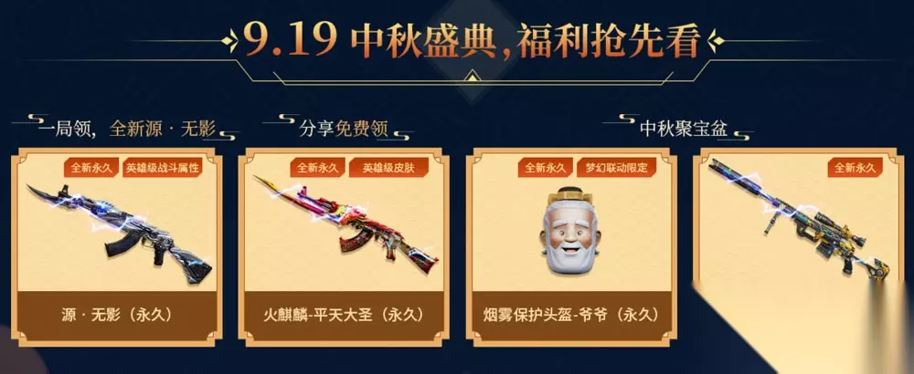 CF中秋预热活动 9.19奖励预览:爷爷烟雾头、妲己、冠军幻神、火麒麟平天大圣皮肤、御・雷神-葫芦兄弟、齐天大圣角色等等