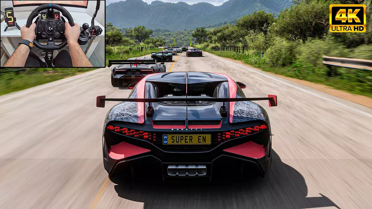 本视频展示了一场自定义比赛,驾驶者使用改装的布加迪Divo车辆,配合罗技G923方向盘和罗技G档杆进行游戏操作,游戏场景设定在极限竞速地平线5中。