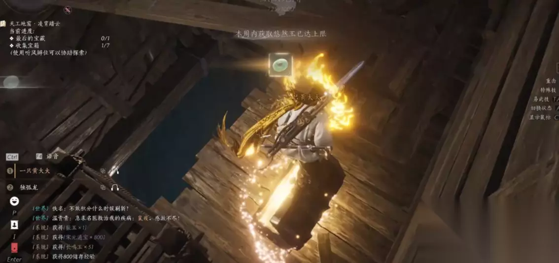 2. 初探地窟:吊桥与初始宝箱 进入大门后可见吊桥,跳至空中使用千斤坠重击地面,触发机制让吊桥缓慢下降。 通过吊桥后,贴着墙壁分层下落(避免直接坠落受伤),在吊桥下方及周边木板区域拾取首个宝箱。