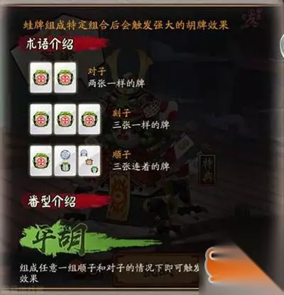在说胡牌之前我们肯定要先对这个玩法有一定的了解才行,其中对子、刻子和顺子就是这个玩法中的基本牌型。而我们手中的蛙牌组成特定的组合时就会触发强大的胡牌效果,就比如上述的平胡效果就是对敌方群体造成大量伤害。 呱士无双胡牌介绍 平胡