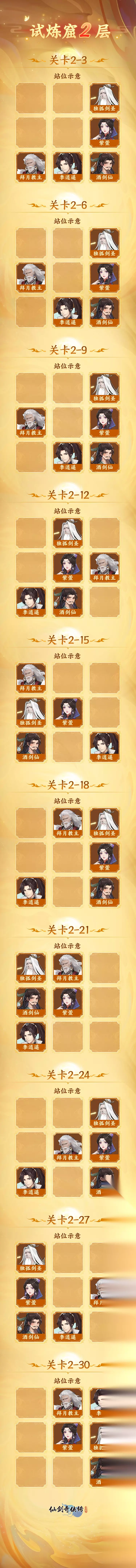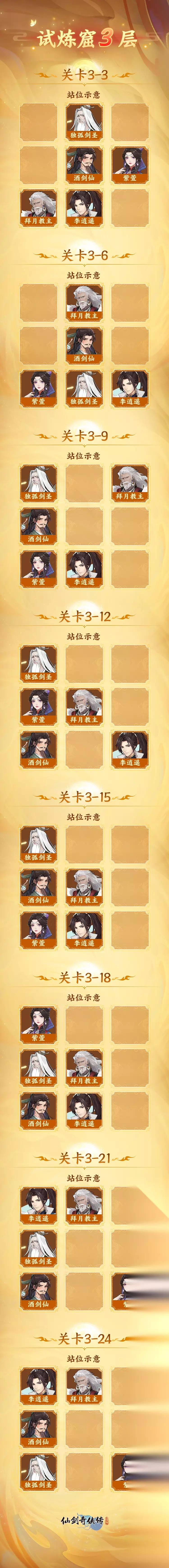【玩家攻略】试炼窟1-3层通关阵容参考 本攻略由 明星攻略官:jm创作 *不代表官方观点 从今天开始,将与各位籼米一起分享关于主线战斗阵容的攻略,攻略将从试炼窟开启,助力各位籼米顺利推进主线,攻略将通过分享jm大神通关的阵容,以及站位的安排情况为主轴,同时也会解析一些难以攻破的敌人特点,欢迎籼米持续关注,话不多说,攻略开始咯! 试炼窟一层 本层利用游戏中的等级压制,将阵容升级至105级就能轻松打过。 伙伴配置 1、独孤剑圣(109级):主力输出伙伴,白3圆满(上阵天地灵脉),五气朝元(脾10),天赋13,修炼12(并升满)。装备橙5星套(太阴),装备强化130(武器140),神兵2星洛神,灵蛊:2星飞鱼、2星水神、2星天命、2星冰蚕、2星幽灵、1星火神(最强的我都给剑圣了)。御魂战意勃发套(神铸套)。 2、拜月教主(109级):主T,白3圆满(上阵天地灵脉),五气朝元(肝3)天赋11,修炼10(并升满)。装备橙5星套(太阴),装备强化40,神兵2星离魂。灵蛊4紫1蓝(飞蝇、火灵、希望、贪吃、相思、水蛊),御魂同仇敌忾套(18级)。 3、酒剑仙(白1,109级):天赋8,修炼4。装备橙5星套(太阴),装备强化40,神兵1星墨梅。灵蛊3紫3蓝,御魂战意勃发套(18级)。 4、紫荁(10星108级):天赋7,修炼4。装备橙5星套(太阴),装备强化40,神兵1星洛神。灵蛊4紫1蓝,御魂战意勃发套(15级)。 5、李逍遥(9星109级):天赋7,修炼4,装备橙4星套(太白),装备强化30,灵蛊2紫3蓝,御魂同仇敌忾套(防御件18)。 伙伴站位 注意事项 有很多小伙伴卡在1-36关了,原因就是输出不够无法快速击败对手,最后被4个奶妈耗死。我这次通过就是第2回合酒剑仙开大双暴击击败了前排蜈蚣。 因此产生了一个问题:酒剑仙到底是用战意勃发还是致命一击。通过这个例子,可以了解到酒剑仙最好用战意勃发,理由就是当你需要酒剑仙秒人的时候,战意勃发能够最大化输出(开大双暴击),而致命一击只是让你单场战斗总输出最大,在竞技或者推图中作用都不如战意勃发,刷神树伤害副本比较适合。 试炼窟二层 对于我先做拜月后做紫萱的人来说,这个阶段剑圣提升乏力,紫萱又未圆满,酒剑仙也只是白1,输出能力真的很难受,尤其是碰到多奶妈阵容和物减高的阵容。 介绍一下我同级别、战力相当的盟友主力阵容是:白3剑圣,白3紫萱,白3徐长卿,白1酒剑仙和主角李逍遥(据了解柳梦璃是白1,拜月9星),因为他有3个圆满英雄,所以他的推图能力比我要好(主线,蜀山,五灵法阵这些副本略领先于我),我在竞技上要略强于他。 所以到底是目标以推主线为主,还是以竞技为主呢,籼米可以综合考虑再做定夺。 伙伴配置 除紫萱以外,其他都与通关试炼窟一层的阵容相同,所以这里就只分享一下紫萱的配置吧。 紫萱(白2,109级):天赋7,修炼4。装备橙5星套(太阴),装备强化40,神兵1星洛神。灵蛊4紫1蓝,御魂战意勃发套(15级)。 伙伴站位 注意事项 很多人仍然会卡在2-30这关,原因就是输出不够无法快速击败一个,被4个奶妈耗死。所以你在第2回合酒剑仙开大不能击败一个草精的话,就放弃重来吧。御灵建议带大黄和树妖双控。酒剑仙御魂建议用战意勃发。 试炼窟三层 通关试炼窟2层后,给剑圣做全一套橙6星装备。便去尝试推试炼窟第3层,越发觉得输出乏力,酒剑仙的开大双连暴成了关键,几次为了保证剑圣和酒剑仙的输出,都要把紫萱扔在外面送死回血,本层通关阵容和2层差不多,主要在3-21和3-24这二关耗了点时间,最后会给大家简单分析一下。 伙伴配置 1、独孤剑圣(109级):主力输出英雄,白3圆满(上阵天地灵脉),五气朝元(肺2),天赋13,修炼12(并升满)。装备橙6星套(太阳),装备强化130(半套140),神兵2星洛神,灵蛊:2星飞鱼、2星水神、2星天命、2星冰蚕、2星幽灵、1星火神(最强的我都给剑圣了)。御魂战意勃发套(神铸套)。 2、拜月教主(109级):主 T ,白3圆满(上阵天地灵脉),五气朝元(肝3)天赋11,修炼10(并升满)。装备橙5星套(3件太阳),装备强化40,神兵2星离魂。灵蛊4紫1蓝(飞蝇、火灵、希望、贪吃、相思、水蛊),御魂同仇敌忾套(18级)。 3、酒剑仙(白2,109级):天赋8,修炼4。装备橙5星套(3件太阳),装备强化40,神兵1星墨梅。灵蛊3紫3蓝,御魂战意勃发套(18级)。 4、紫萱(白2,109级):天赋7,修炼4。装备橙5星套(3件太阳),装备强化40,神兵1星洛神。灵蛊4紫1蓝,御魂战意勃发套(15级)。 5、李逍遥(9星109级):天赋7,修炼4,装备橙4星套(太白),装备强化30,灵蛊2紫3蓝,御魂同仇敌忾套(防御件18)。 伙伴站位 注意事项 3层最难打的是3-21,如果你不能快速击败蜂巢,它每回合都会放出1只小蜜蜂。我起手用大黄咬晕1回合,再用李逍遥的逍遥神剑定晕第2回合,最后酒剑仙开大连击打残血,才让它只放出1只小蜜蜂。这也是我这套阵容最大的短板。当然优势也很明显,就是拜月比较能扛,我经常用拜月扛4个怪。本关御灵建议带大黄和树妖双控,酒剑仙御魂建议用战意勃发。 试炼窟一到三层的攻略就先到这里啦,后续的主线闯关阵容分享将持续更新,欢迎籼米持续关注我们~