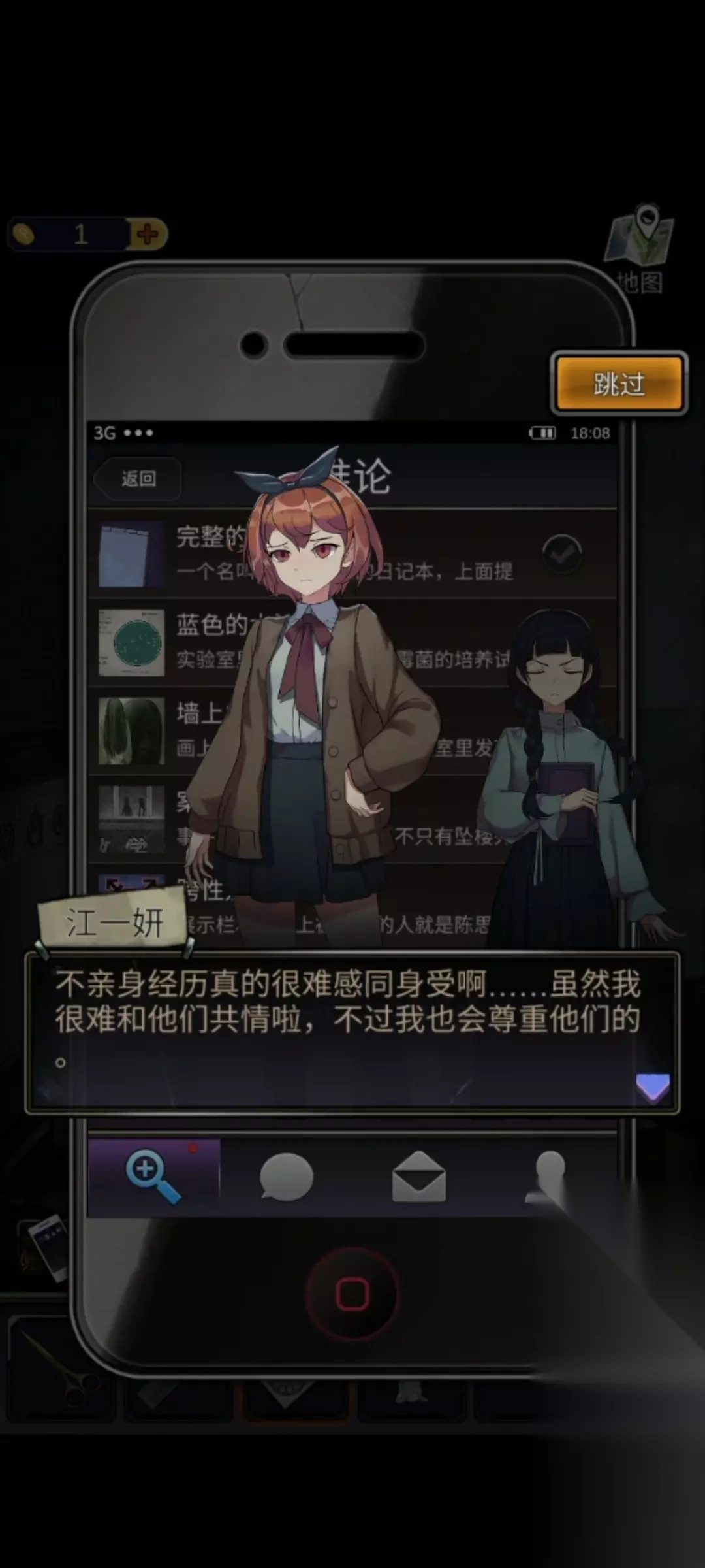 在第一章,我们得到全部线索之后,推导推论的公式是这样的。 【日记本1】+【日记本2】+【日记本3】得到【完整的日记】 【合照】+【女生的照片】+【诊断书】+【广播站站长】得到【跨性别者】 【实验报告册】+【荧光蓝色的自来水】得到【水池】 【一张收据】+【宣传纸】得到【禁锢灵魂的法阵】 【墙上的画】+【致幻剂】+【颜料标签】得到【墙上的画】 【纸条】+【未接来电】+【录像带】得到【案件发生当晚】 【日记本1】+【宣传纸】得到【天地教的符号】 【合照】+【课桌】+【展示墙】=【被欺凌的人】