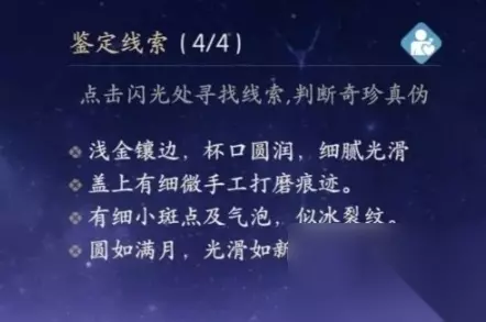 3.按照提示,点击藏品的闪光处,就会出现辨别真伪的线索;