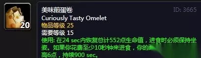魔兽世界怀旧服美味煎蛋卷 效果:在24秒内恢复552点生命值,进食必须保持坐姿。如果进食至少10秒,则提高6点耐力和精神,持续15分钟