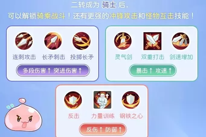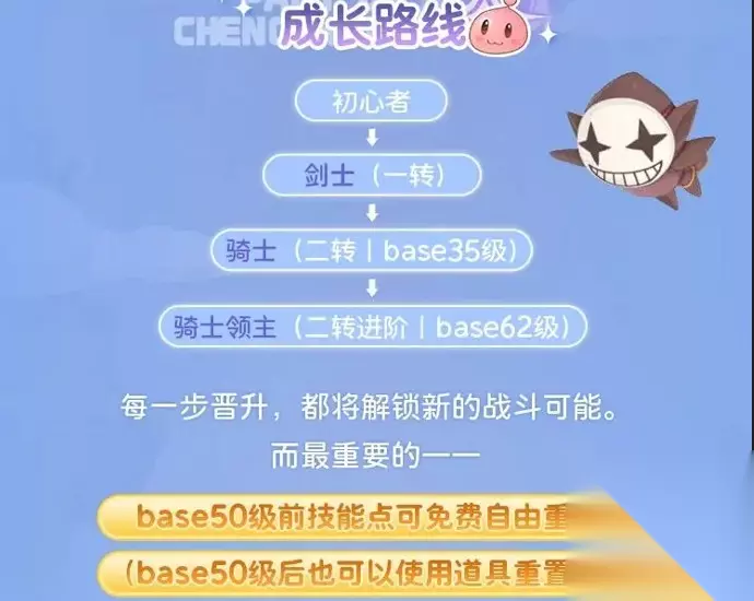 二、成长路线 初心者→剑士(一转)→骑士(二转| base35级)→骑士领主(二转进阶| base62级) 每一步晋升,都将解锁新的战斗可能。base50级前技能点可免费自由重置,base50级后也可以使用道具重置哦!