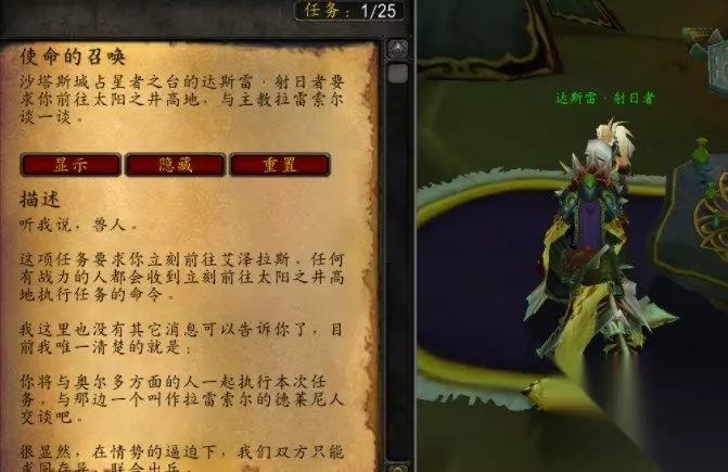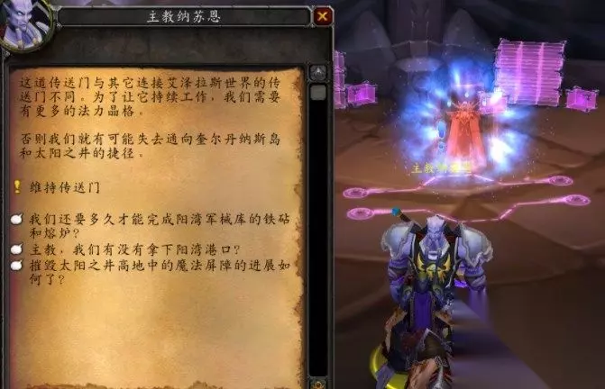 同时,奎岛的“商人波塔努斯”会刷新“向纳苏恩报道”的任务,可以解锁一个前往刀锋山的临时日常任务“截获法力晶格”,这有250点声望,当任务达成数量要求,就能在沙塔斯城开启前往奎尔丹纳斯岛的传送门。(这个任务不会增加阶段进度,只是开传送门的临时任务)
