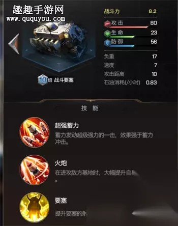 兵种属性: 战斗力:8.2 攻击:80 生命:23 防御:56 负重:17 速度:7 攻击距离:10 石油消耗:0.83/小时 技能一览: 超强蓄力:蓄力发射超强力的一击,效果强于蓄力冲级。 火炮:在攻击敌方基地时,大幅提升自身攻击力。 要塞:提升要塞的射程、防御和血量。