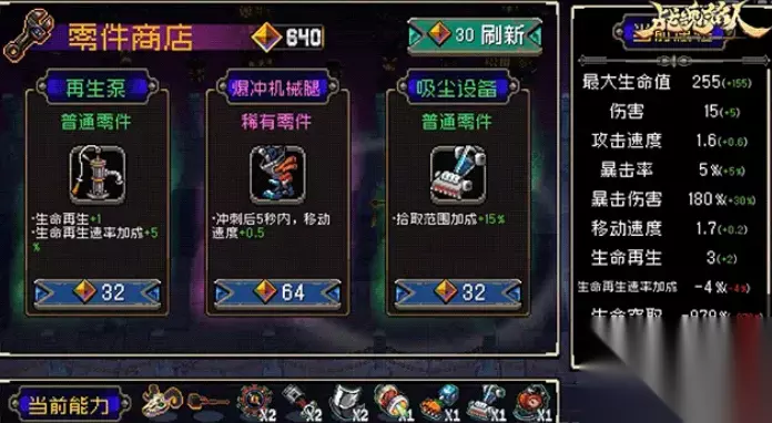 每一波胜利后,战士们可进入到零件商店,用灵魂币来买零件,零件的不同会带来不一样的属性加成,有一些甚至还带有负面或独特效果,利用核心、武器、芯片和零件这几大物品,可以在有限时间抵御不同怪物。