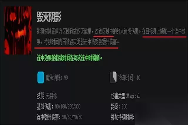 影魔的主动输出技能,也是经常用来清兵以及打伤害的手段,玩家们喜欢叫影压,此技能有三段效果其距离都不一样,近、中、远。玩好这个英雄前提就是需要掌握好此技能的距离感,去预判打伤害。