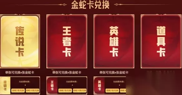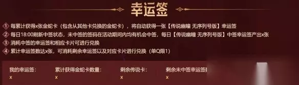 4、每日18:00刷新中签状态,幸运签在互动内均有机会中签。 5、使用指定数量的【传说卡】【王者卡】【英雄卡】【道具卡】也可以兑换出【金蛇卡】。