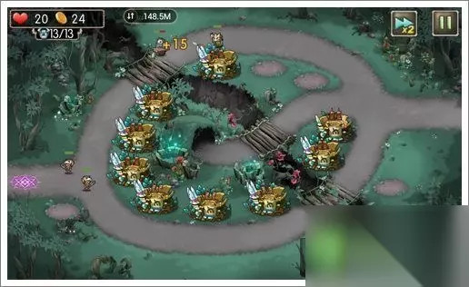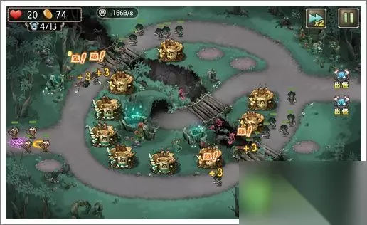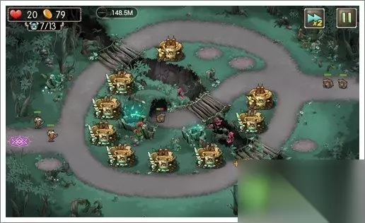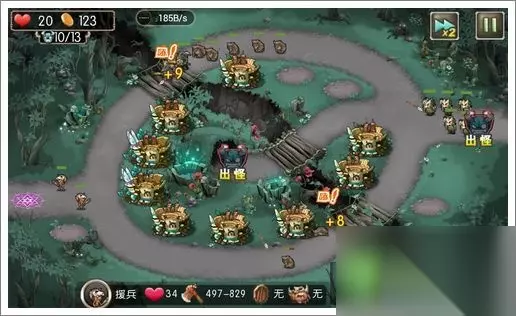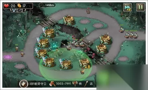 过关攻略 1、初始布局如下,中间的圆圈布满9个初级箭塔;