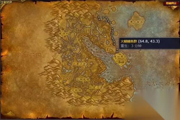 【攻略大全】 魔兽世界火鳞鳝鱼群在哪 答:尘泥沼泽、荆棘谷、凄凉之地、贫瘠之地、阿拉希高地 位置介绍: 1、尘泥沼泽:分布最多,分布在【塞拉摩岛】的上方,坐标(62.2,23.9)周围可找到;