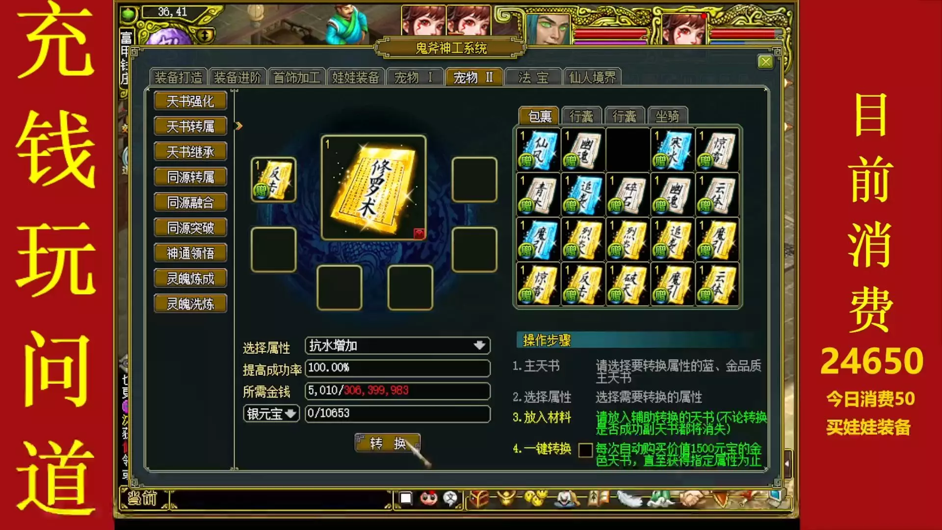 这是《充钱玩问道》第八期内容,作者在问道中充值4900,用于购买法宝、如意等道具,还展示了游戏内战斗、组队、装备等界面,最终回本119万游戏币。