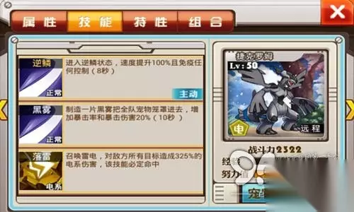【黑神-捷克罗姆】 捷克罗姆为龙系和电系的传说中的小精灵。特性兆级电压,在使用技能时不受目标特性影响。在游戏中,捷克罗姆的技能为逆鳞:速度提升100%且免疫任何控制(8秒);黑雾:黑雾把全队笼罩,增加暴击率和暴击伤害20%(10秒);落雷:对所有敌方造成325%电系伤害,必定命中。 编辑推荐: 《宠物小精灵》“ 吉米空”上架震撼降临 《宠物小精灵》神兽大盘点 《宠物小精灵》世界BOSS新玩法
