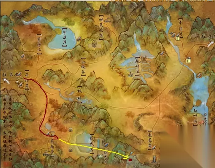 2、地图中红线标示的路线可以坐马车,省时省力,黄线路线部分需要自己轻功或者骑马过去到荻花圣殿。