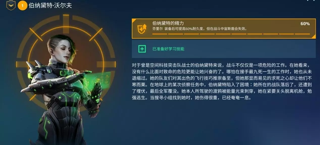而坦克形态则主要用于和敌人的距离足够近,双方交火时。因为在流动形态下,芬里尔的重型武器处于收起状态,这将一定程度上削弱其火力。但两个中型武器依然足够压制部分机动型机甲,更不用说坦克形态还将赋予芬里尔50%常驻减伤性,这使它在与其他机甲单对单作战时能获得巨大的优势。 需要注意的是,虽然芬里尔正面作战能力十分强大。但无论是泰坦,或是防御突破武器都能有效针对限制它,因此指挥官需要尽量早的召唤芬里尔,在敌方泰坦还在充能时斩获足够多的战果,为己方拿下更大的优势。 飞行员:伯纳黛特·沃尔夫
