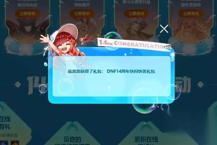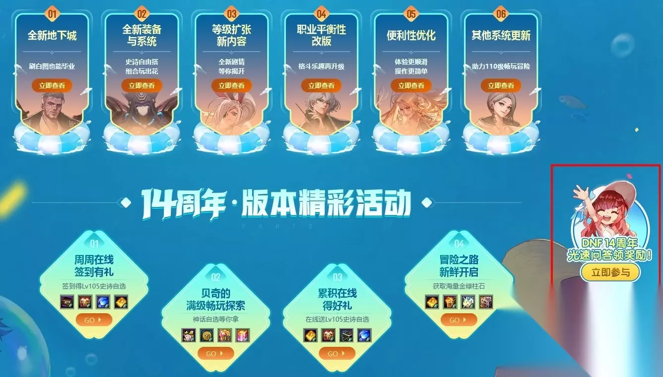 玩家进入活动页面后,在14周年版本精彩活动板块处点击右侧浮窗打开答题界面。