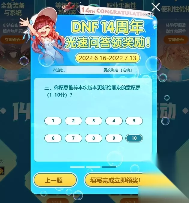 该活动其实是一个问卷形式的活动,题目一共有三道,玩家可以选择题目中提供的任意一个答案,不管玩家如何选择答案,最终的奖励都是一样的。答题的奖励是1个装备提升礼盒、1天的王者契约礼包和3天黑钻。 《DNF》官网答题活动2022 活动时间:6月16日 - 7月13日 活动内容: