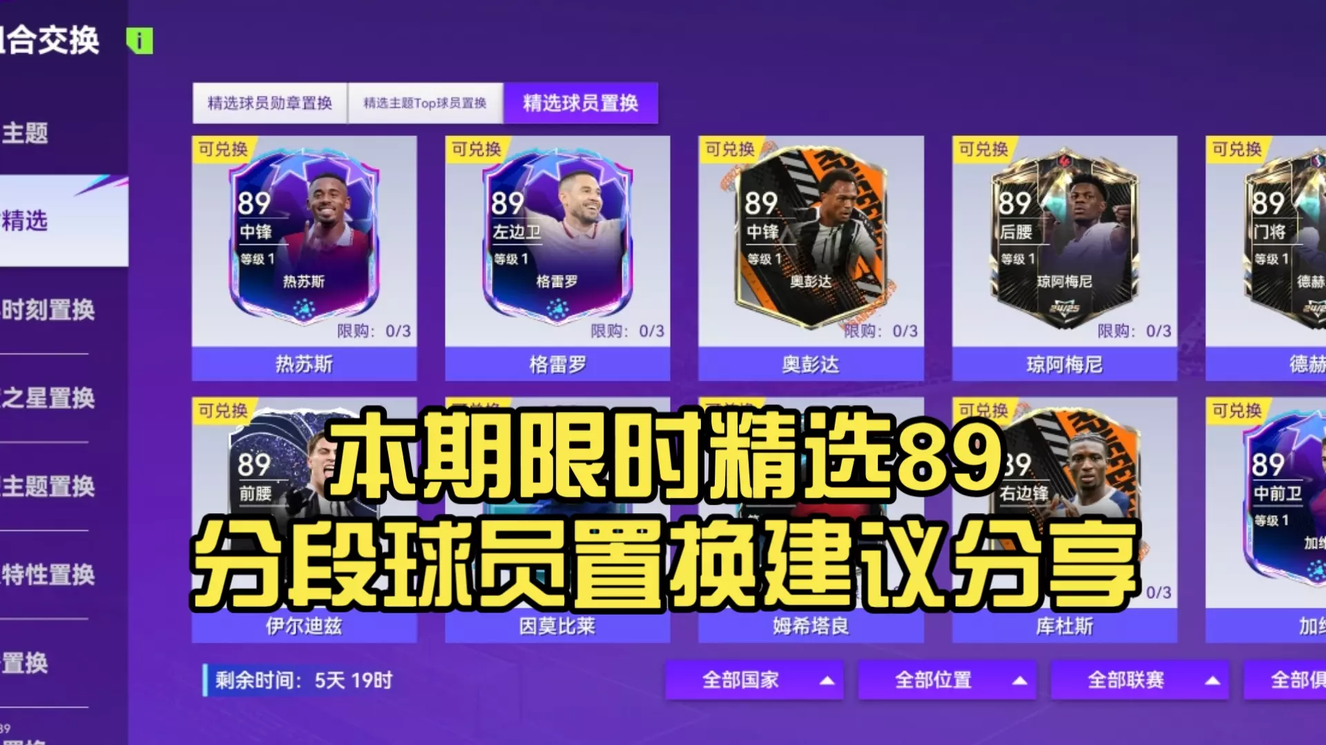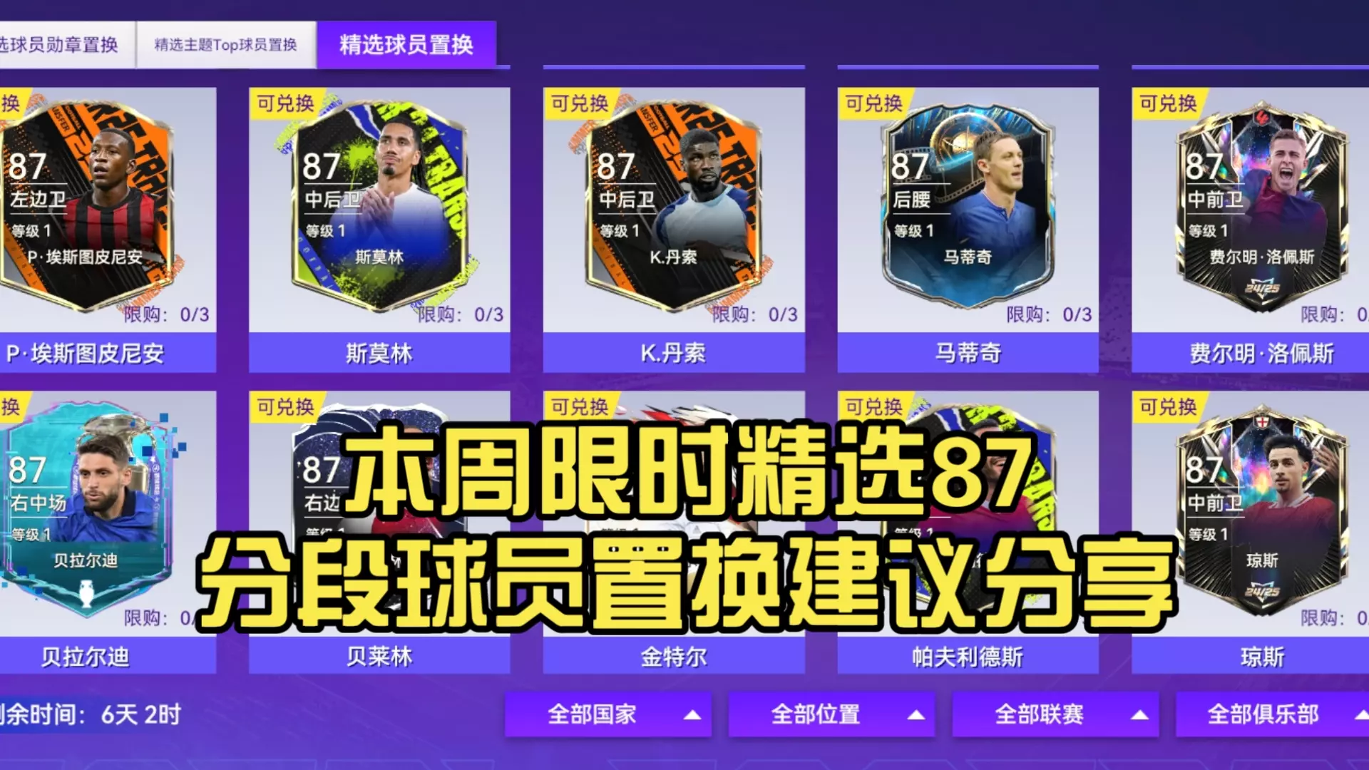 本周精选球员置换推荐完毕
